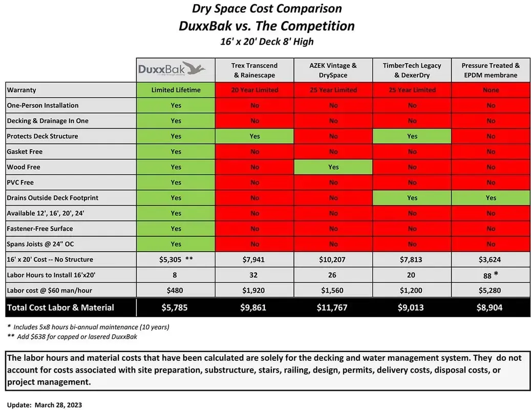 DuxxBak Decking offers a cost-effective solution for waterproofing the underside of your deck. For just a small additional investment, you can ensure that the area beneath your deck remains dry and functional. This waterproofing option is in contrast to using products like Trex Rain Escape©, which can be significantly more expensive and result in higher overall project costs. By comparing the prices and evaluating the benefits of each option, you can make an informed decision for your specific needs and budget. DuxxBak Decking's affordability in providing waterproofing for your deck's underside makes it a compelling choice for those looking to maximize functionality while keeping costs in check.