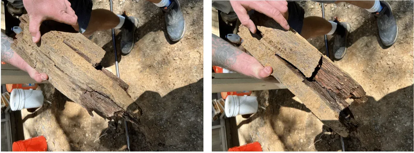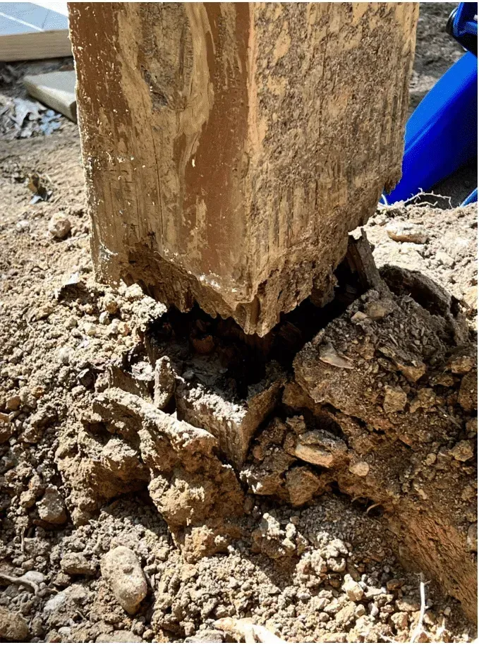 In order to do it right, this is an all day job for two men to replace a tall, rotten 6x6 post, remove the existing concrete footing and reinstall a new concrete footing with new PT post and coat the wood with Stonewood prior to installation. Cost therefore runs $1000 per post labor with our client paying 4 X material cost. Note: One part pays for materials. One part pays labor. One part is overhead. One part is profit. BTW, if one post shows this kind of decay, it is a safe bet that all posts are rotting as well. Do not wait to get this repair done. Putting it off will cost even more later. Call now.
