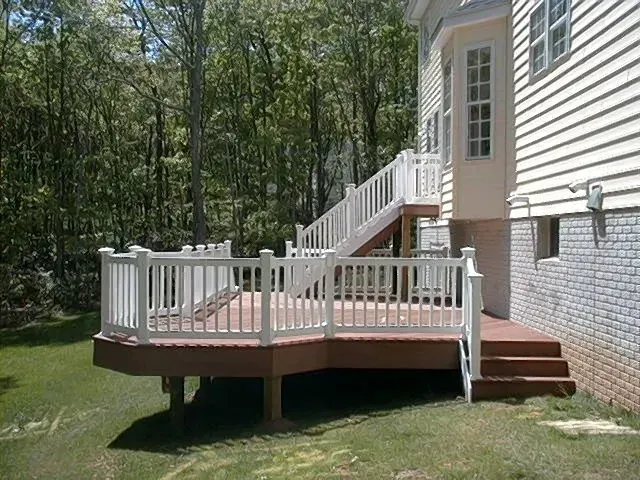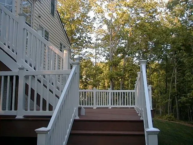 This deck was designed with matching GeoDeck fascia covering the stair risers. White vinyl looks good, too.
