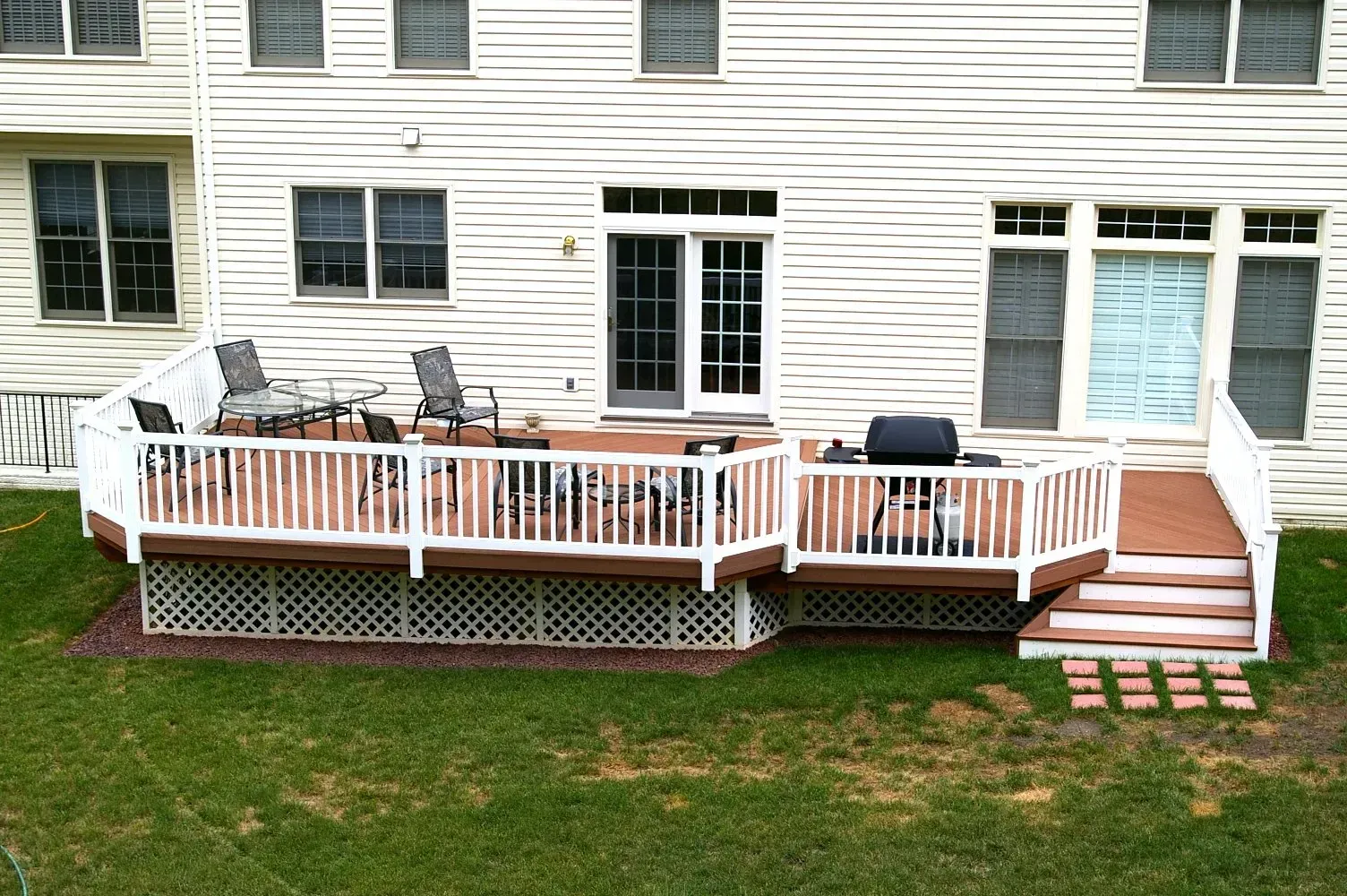 As we move around this beautiful composite deck made of GeoDeck decking and vinyl railings by Fairway, notice again how the white vinyl railing and lattice skirting show off the deep, rich mahogany color of the GeoDeck decking.