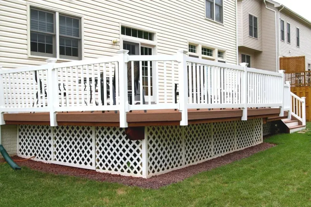 Notice the GeoDeck floor has been wrapped in GeoDeckfascia to hide the pressure treated joists and help create a maintenance free deck. The white PVC lattice, framed and trimmed, finishes off the deck.